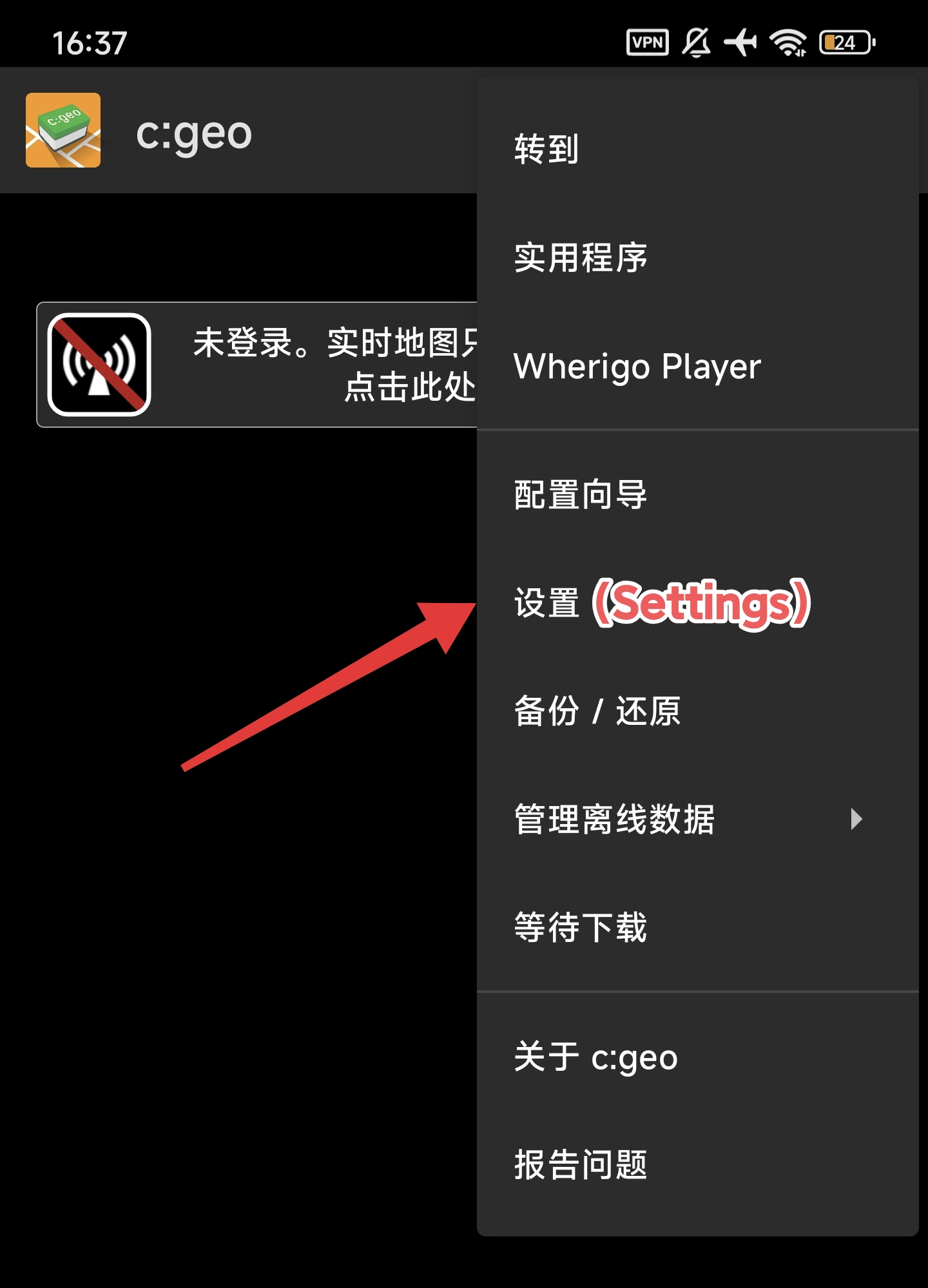 安装后打开 c:geo,将底部导航切换到 首页 (Home)。点击右上角的三个点,在下拉菜单中选择 设置 (Settings)。