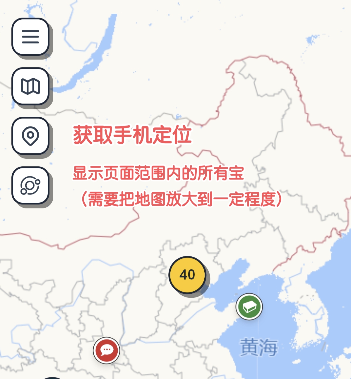 tftc.top 使用指南¶ tftc.top 是一个由热心宝友开发的第三方寻宝地图网站,提供了一个简洁易用的界面,帮助国内玩家在手机上查看附近的藏宝点信息。 默认情况下,页面只会显示最近 10 天内新增的藏宝点。 如何设置语言为中文¶ 在页面左上角点击三条线按钮,在菜单中找到设置项,将语言切换为中文即可。 如何查看附近的藏宝点¶ 开启页面左上角的两个按钮,然后把地图放大并移动到你所在位置附近,即可看到周边藏宝点。点击藏宝点图标可查看详细信息。